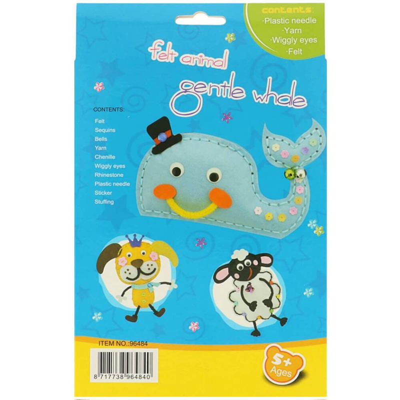 Kinderen maken zelf een vrolijke walvis met dit speciale viltpakket! Elk pakket bevat stukken voorgesneden vilt, garen, wiebeloogjes en een plastic naald. Geschikt voor kinderen vanaf 7 jaar.