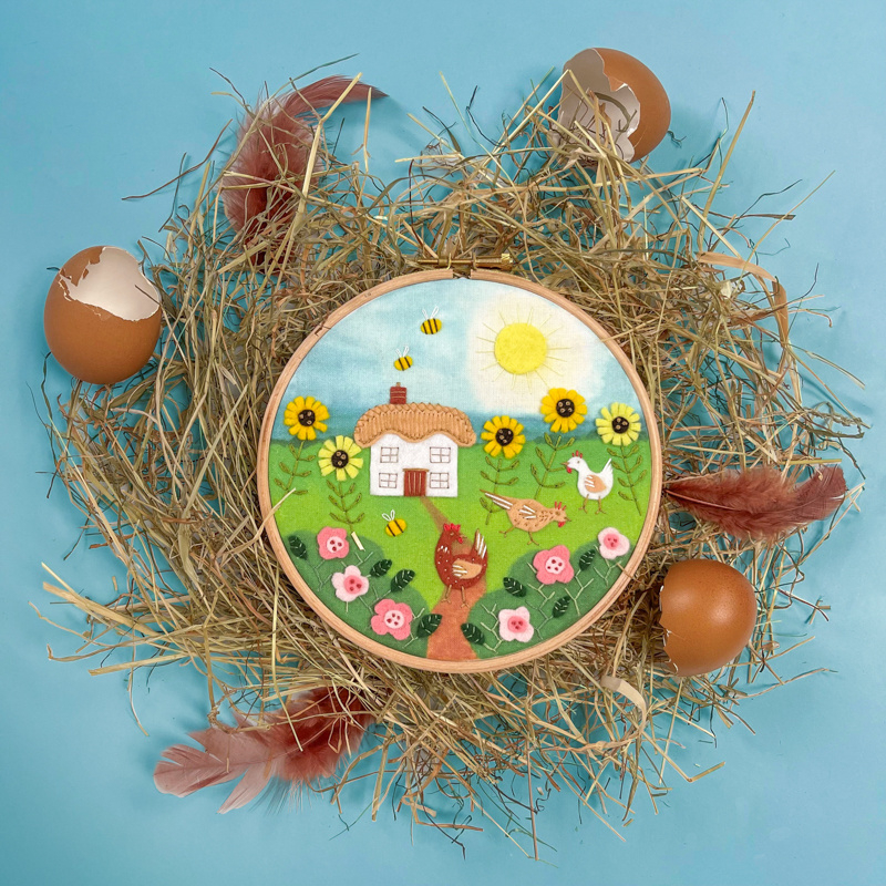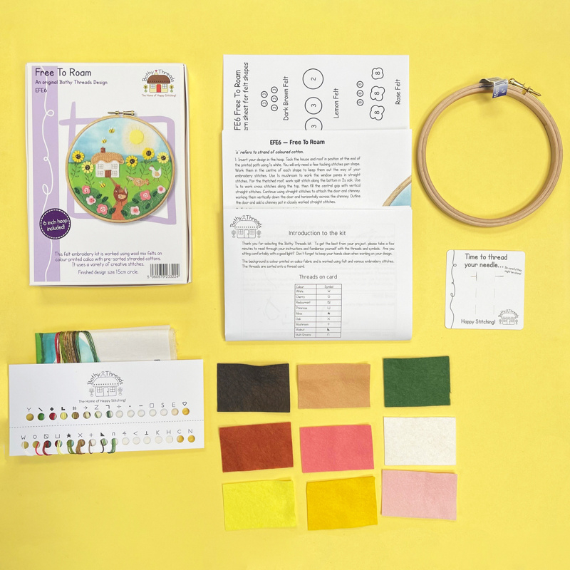 Compleet borduurpakket met vilt en garen gemaakt met een mix van wolvilt op in kleur gedrukt calicostof. Er wordt gebruik gemaakt van een verscheidenheid aan creatieve steken.