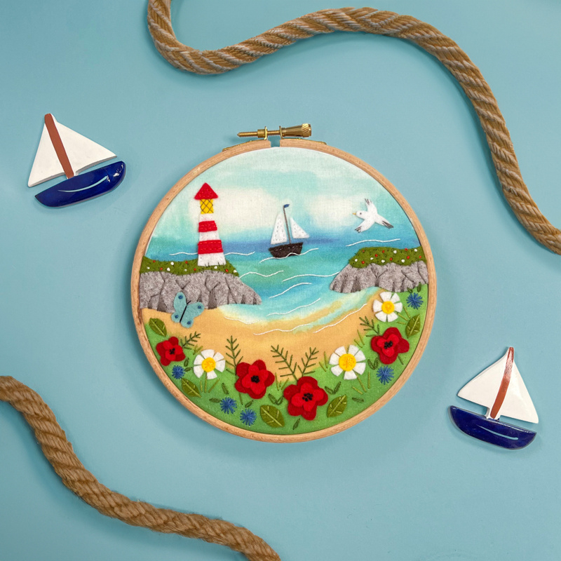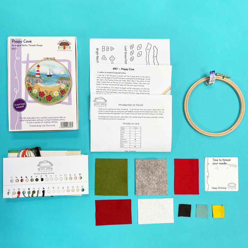 Compleet borduurpakket met vilt en garen gemaakt met een mix van wolvilt op in kleur gedrukt calicostof. Er wordt gebruik gemaakt van een verscheidenheid aan creatieve steken.